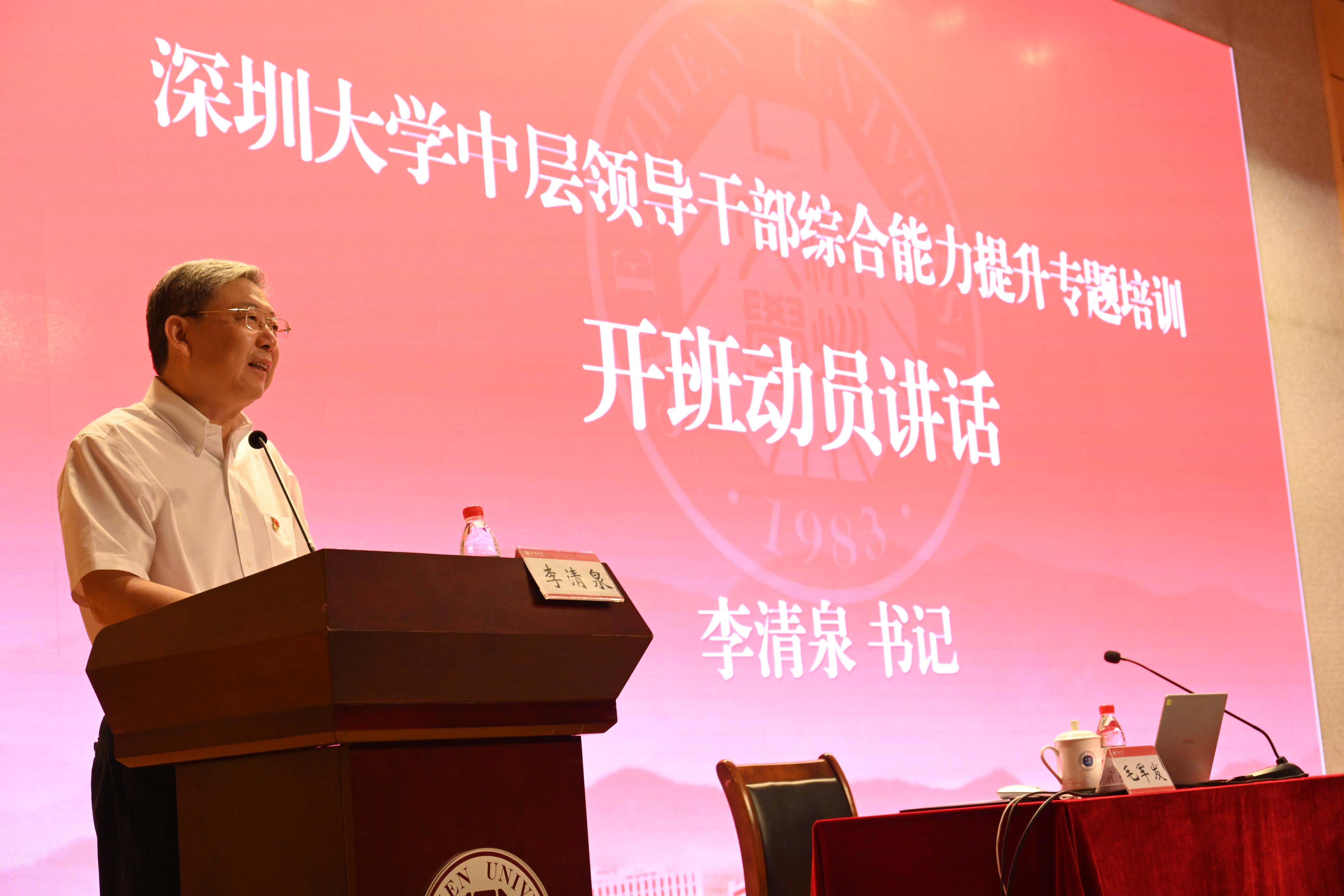 6月28日,vsport新一届中层领导干部综合能力提升专题培训开班仪式暨校长讲党课在汇星楼举行。李清泉作开班动员讲话,他鼓励全体中层干部坚定理想信念,坚持理论学习,提高政治素质,严守政治底线;敢于担当作为,具有责任意识,面对风险敢于担当、敢于担事,无私无畏,发扬吃苦耐劳的精神;塑造过硬本领,尽快适应工作岗位的变动和工作角色的转变,树立终身学习理念,不断提高自身领导能力和水平;讲团结顾大局,坚持廉洁本色。毛军发以《中国式现代化进程中的高等教育发展思考》为题,结合学习贯彻习近平新时代中国特色社会主义思想主题教育,围绕“高等教育发展要求、深圳需要一流大学、vsport使命担当”三个方面讲授专题党课。