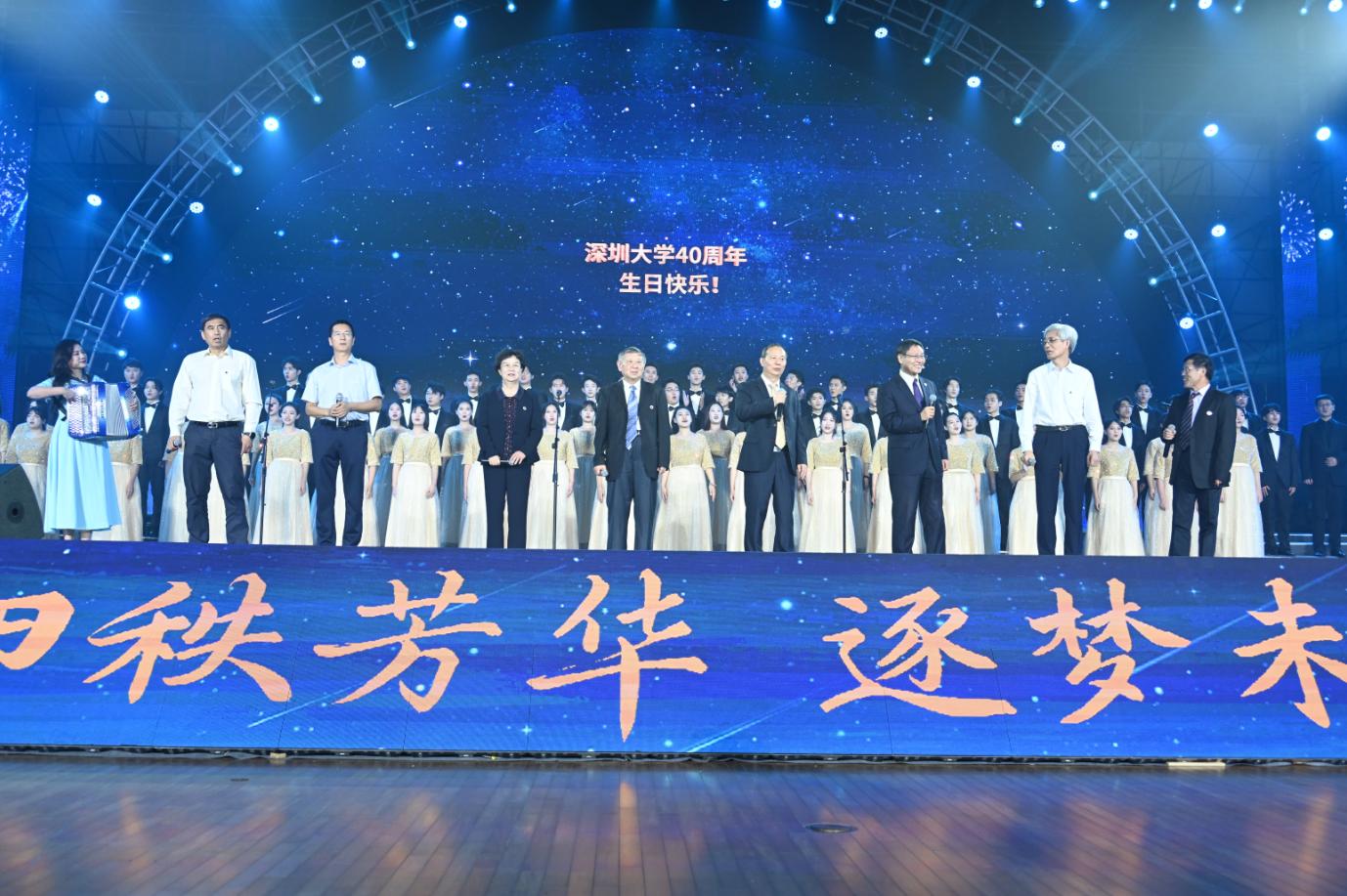 不同国家不同民族的深大学生在舞台上载歌载舞,仿佛在告诉所有人,这里是深圳,《深圳与世界没有距离》;这里是深大,在深大可以看到全世界的精彩,《we’re all in this together》。四十年是一段有迹可循的《流金岁月》,深大人创造了一段不被定义的《追光》旅程,校友们对母校的爱《情深似海》,是他们的《勇往直前》带给了每一个深大人追梦的勇气。他们用年轻的笔写下自立、自律、自强的《三自经》,用希望的歌声唱出四秩芳华的诗篇,并将携手并进,筑一场创新驱动未来的远航。