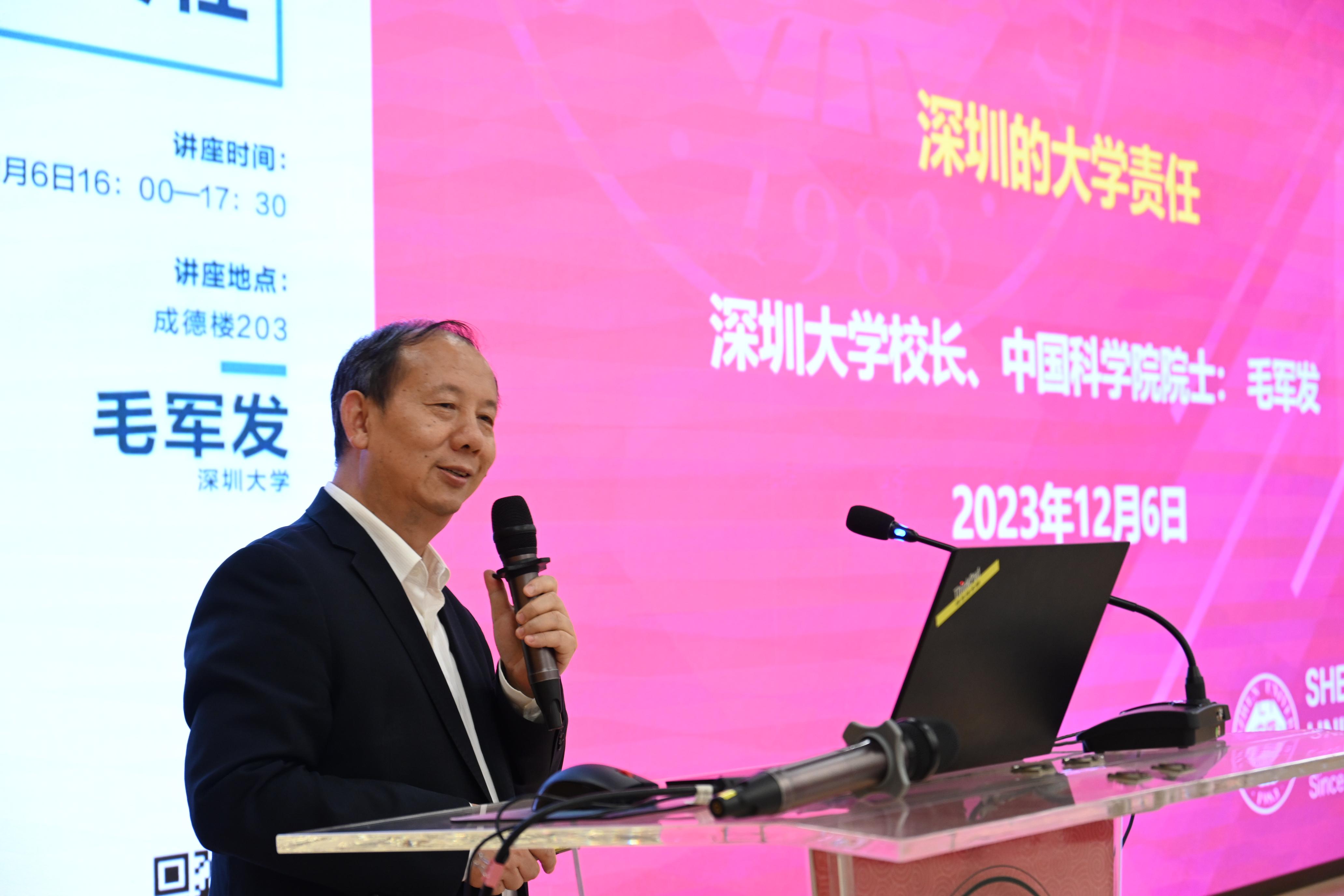 “在国家建设历程中,一流大学担当着怎样的责任?深圳高校又应如何担当起时代重任?”12月6日下午,“深中大讲堂”座无虚席,vsport校长、中国科学院院士毛军发应邀开展讲座,他以“深圳的大学责任”为题带来了精彩一课。深圳中学校长朱华伟、副校长娄俊颖出席活动。深圳中学近600名师生聆听了本次讲座。