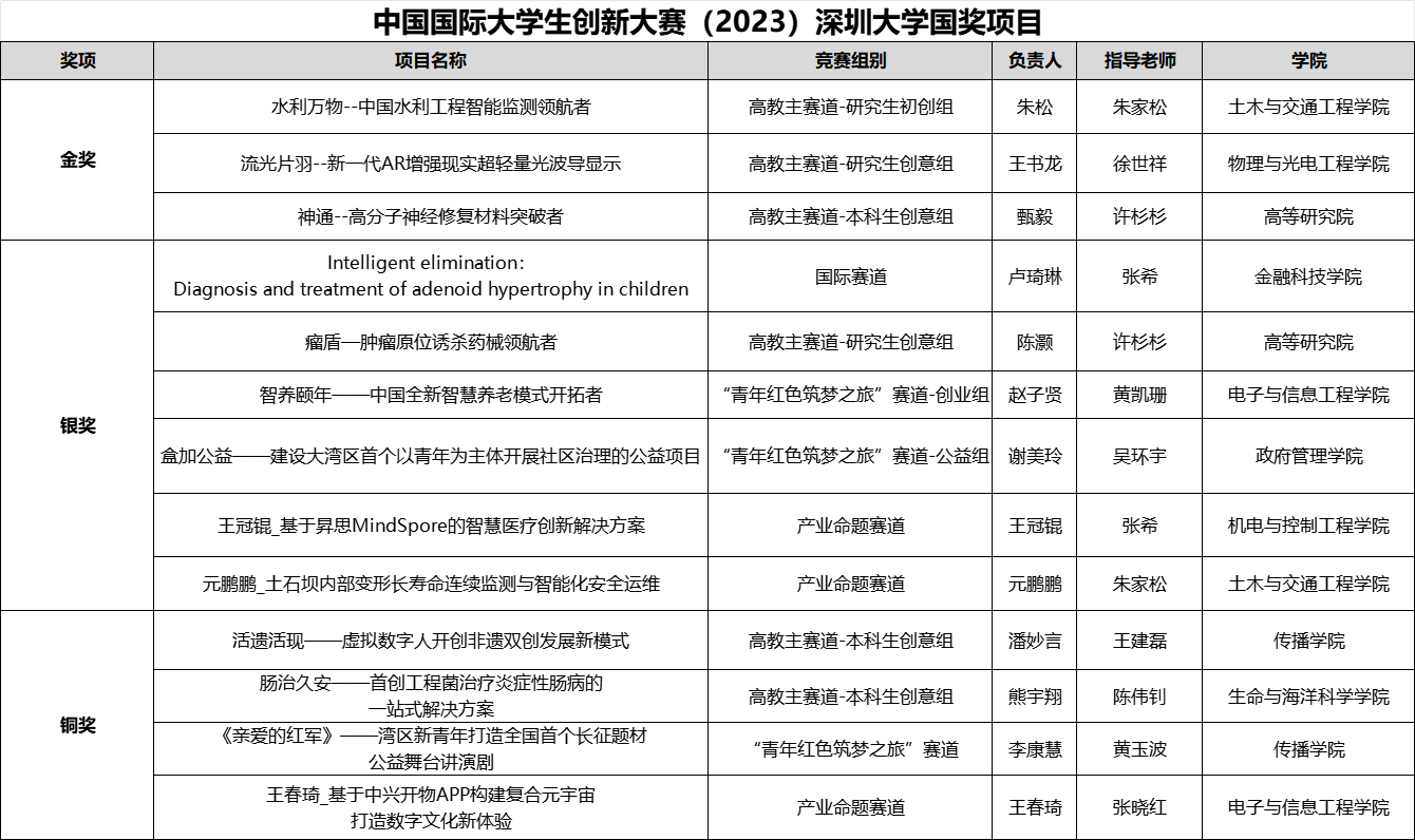 vsport“水利万物——中国水利工程智能监测领航者”“神通——高分子神经修复材料突破者”“流光片羽——新一代AR增强现实超轻量光波导显示”三个项目摘金。其中“水利万物”项目在今年8月举办的中国国际大学生创新大赛(2023)广东省分赛中一举夺魁。
