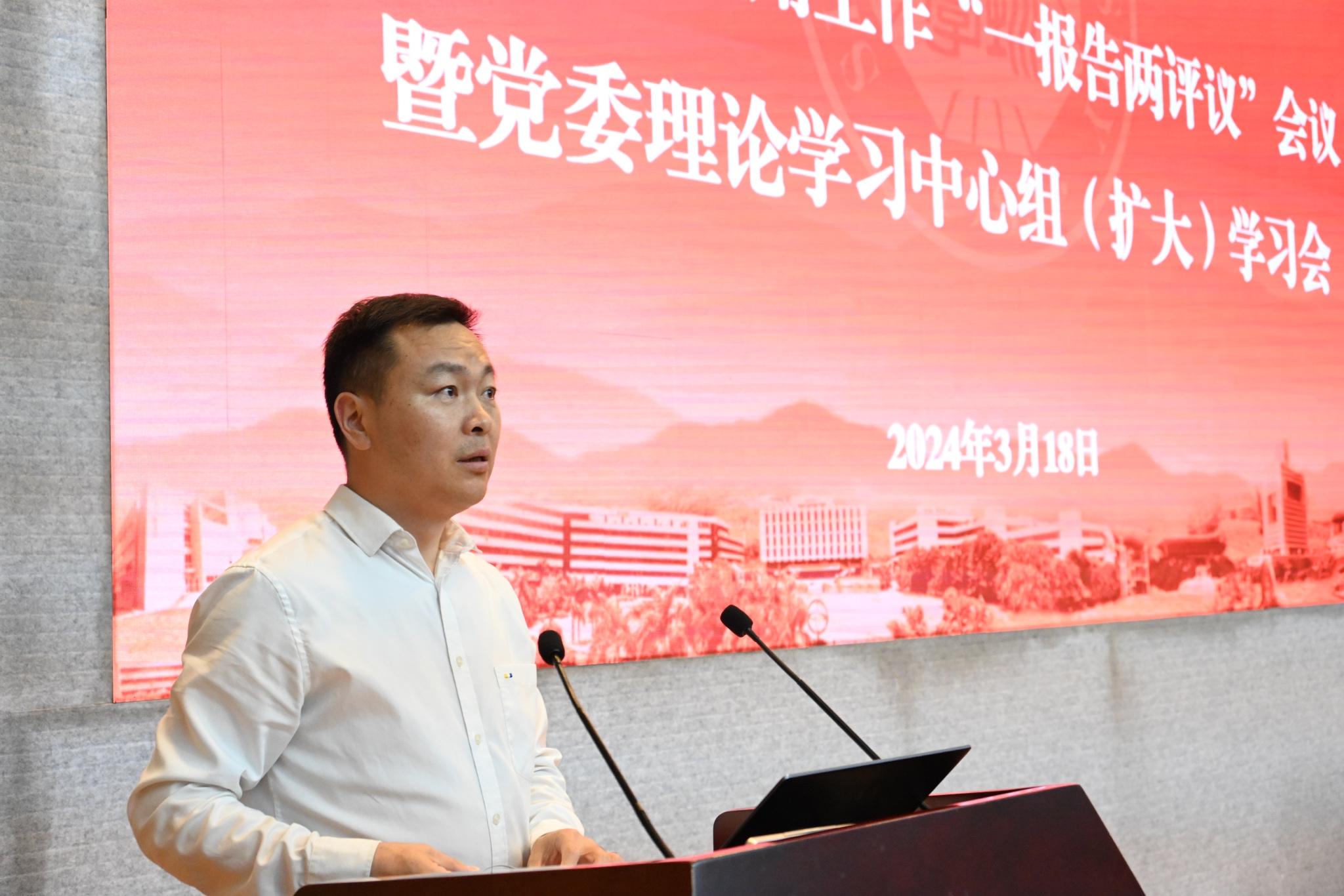 3月18日,vsport2023年度干部选拔任用工作“一报告两评议”会议暨党委理论学习组(扩大)学习会在汇星楼报告厅召开。全体在家校领导、全体中层正职、主持工作副职和党员群众代表参加会议,党委副书记吴报水主持会议。