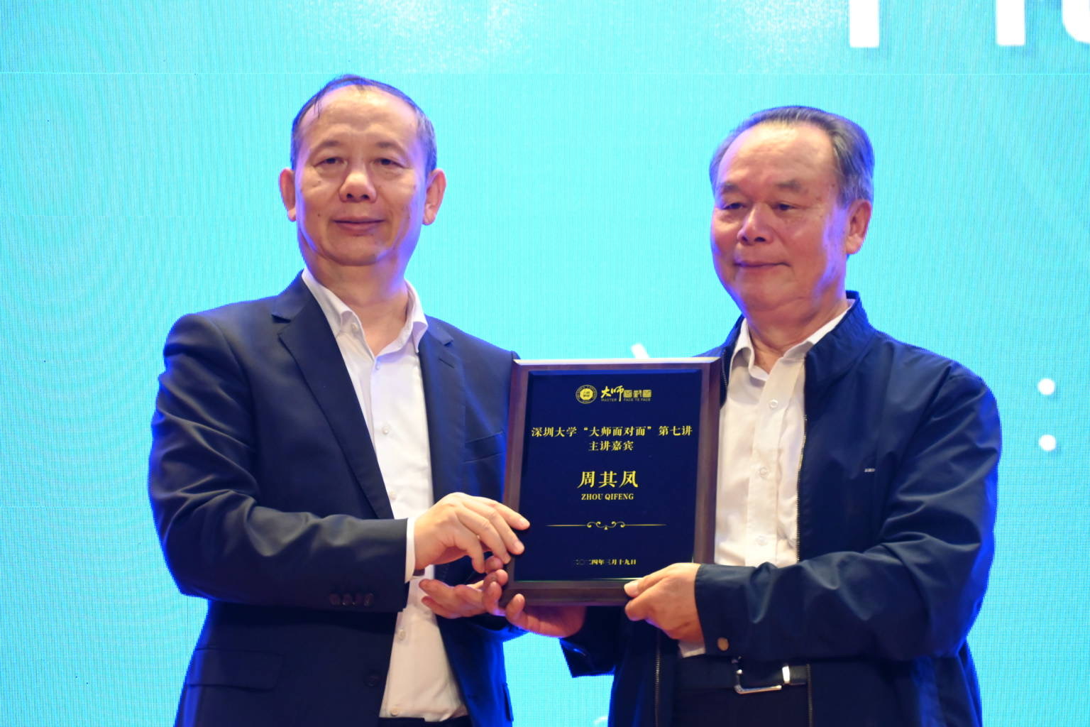 讲座结束后,毛军发向周其凤赠送深大纪念品。