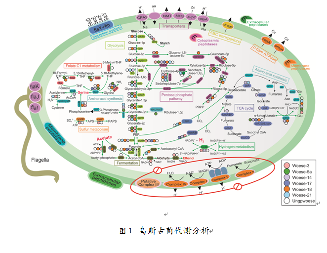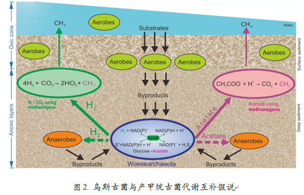 自1977年Carl Woese提出“三域学说”,将地球生物划分为Achaea (古菌),Bacteria (细菌), Eukarya (真核生物)。古菌研究是微生物界热点话题之一,已由最初的2个门(phylum)发展到如今28个。为纪念Carl Woese对生物进化分类学突出贡献,Jill Banfield等将DPANN超级古菌门中一个新发现古菌门命名为Woesearchaeota(乌斯古菌),并揭示该古菌在厌氧碳循环过程中扮演着极为重要的角色。然而,乌斯古菌作为一类重要的古菌,其生态分布、进化及代谢功能鲜有报到。课题组基于这一类古菌的全球分布统计、进化分析、基因组和功能代谢预测研究为乌斯古菌的生态分布、进化分类及其代谢潜能奠定了新的基础。李猛教授团队与香港大学生物科学学院顾继东教授、加州大学贝克利分校Jill Banfield教授、德国杜伊斯堡-埃森大学Alexander J. Probst教授合作,采用生物信息学技术手段,从进化角度将该古菌划分为26个亚群。通过基因组分析发现,乌斯古菌具有高度代谢缺陷(图1),很可能通过代谢互补方式与产甲烷古菌存在共生关系(图2)。研究结果对于认识乌斯古菌在生态环境中的作用,尤其是甲烷产生等方面都有十分重要的意义。