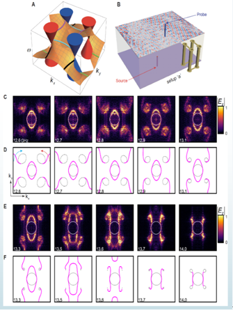最近,英国伯明翰大学张霜教授课题组与vsport范滇元院士团队先进材料光子学课题组、University of Exeter和中科院物理合作,设计并制备了马鞍形状的光子晶体(图1A,B),观测到了理想的外尔系统,其中四个对称性保护的外尔点坐落在同一个频率,并且在这个频率周围没有其他能带干扰(图1C)。他们采用近场扫描的方法测量了该光子晶体的体态和表面态的分布情况(图2)。作为源的探针放在样品的底部,这样可以同时激发体态和表面态。测量的探针在样品的上表面扫描,可以得到近场的振幅和相位分布,然后通过傅里叶变换得到其动量空间的等频面分布情况。从图中的实验和仿真的对比中可以看到螺旋表面态的旋转情况。他们的发现对外尔拓扑态的研究提供了一个理想的平台。