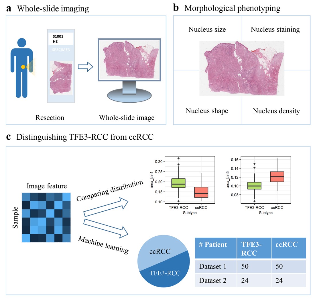 TFE3 Xp11.2 translocations renal cell carcinoma(TFE3-RCC)是一种罕见的肾细胞癌,相较于其他肾细胞癌亚型,其恶性程度更高,但临床诊断过程中病理医生很难通过常规的H&E染色病理切片将TFE3-RCC与其他肾细胞癌亚型区分,而是需要借助其他操作更为复杂的方法如荧光原位杂交进行鉴别诊断。该研究基于常规的H&E染色病理切片,收集了迄今为止样本量最大的TFE3-RCC数据集,设计开发了一种利用计算机自动分析数字病理图像的分析方法(图1),寻找对TFE3-RCC和透明细胞肾细胞癌(最常见的肾细胞癌,约占75%)具有显著鉴别能力的细胞形态学特征,并利用机器学习的方法对这两种类型的癌症进行自动区分。在独立的验证集上,该研究所提出方法的分类性能可达ROC曲线下面积0.894。