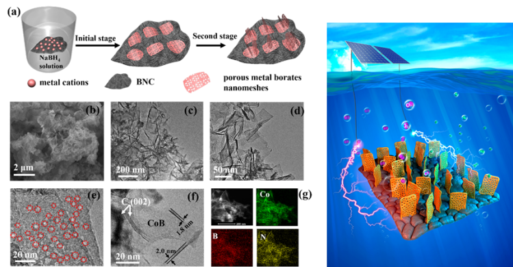 在过去的十年,构建二维过渡金属纳米片已经成为制备高效电催化材料的有效手段。尤其是仅有原子厚度的超薄纳米片具备较大的比表面积、较高的表面/体积比,使得表面原子达到最大的暴露。因此,超薄的纳米片在氧析出反应中普遍具有优异的电催化活性。但是,超薄纳米片的横向质量扩散能力较差,使得其活性难以进一步提高。与之形成鲜明对比的是,超薄的纳米网状材料不仅完美地继承了超薄纳米片的优势,而且具备规则的多孔结构,可以极大地促进电催化过程中的传质,从而提高纳米片状材料的电催化活性。但是,大多数的过渡金属纳米网都是使用硬模板的方法合成,具有合成过程繁琐的缺点。因此,开发简单、有效的方法来合成超薄的过渡金属纳米网并进一步研究其在电催化反应中的独特优势,是十分有意义的。最近,vsport化学与环境工程学院何传新教授课题组介绍了一种利用三维树皮状氮掺杂碳为纳米反应器来合成超薄金属硼酸盐纳米网的通用方法,并将所制备的金属纳米网用于完全电解水,研究了超薄纳米片组成的网络结构在电催化反应中的独特优势。