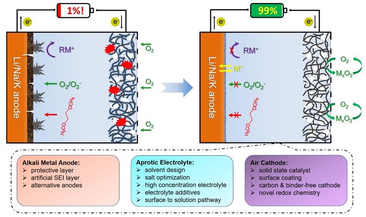 近十年来,新能源电动汽车得到了蓬勃发展,但当前的锂离子电池技术难以满足电动汽车长续航里程的需求。因此,人们迫切期待高能量密度和高输出功率的新电池技术。由锂、钠、钾等碱金属与氧气组成的空气电池因能量密度高、成本低等优势,赢得了业界广泛关注,但此类电池也存在空气电极副反应严重、电解液不稳定、碱金属负极易产生枝晶和体积膨胀、电池生命周期短等缺点,使得二次碱金属空气电池的前景不容乐观。如何提高正极材料在高电位和富氧自由基条件下的稳定性,如何提高电解液对氧自由基的耐受性以及与碱金属负极的匹配性,如何抑制碱金属负极的枝晶生长和体积膨胀,提高负极的稳定性,这些都是目前碱金属空气电池研究中的难点和热点。