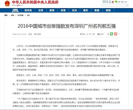 2016123日,2016中国城市创意指数(CCCI2016)在第二届深圳管理创新对话论坛上发布后,受到深圳卫视、《中国质量报》、《南方日报》、《南方都市报》、《深圳特区报》、中国财经网、新华网、新浪网、搜狐网、网易网、腾讯网、东方网等多家媒体报道和转载。特别值得一提的是,中华人民共和国中央人民政府网站与广东省人民政府网站等权威网站也转载了相关报道。