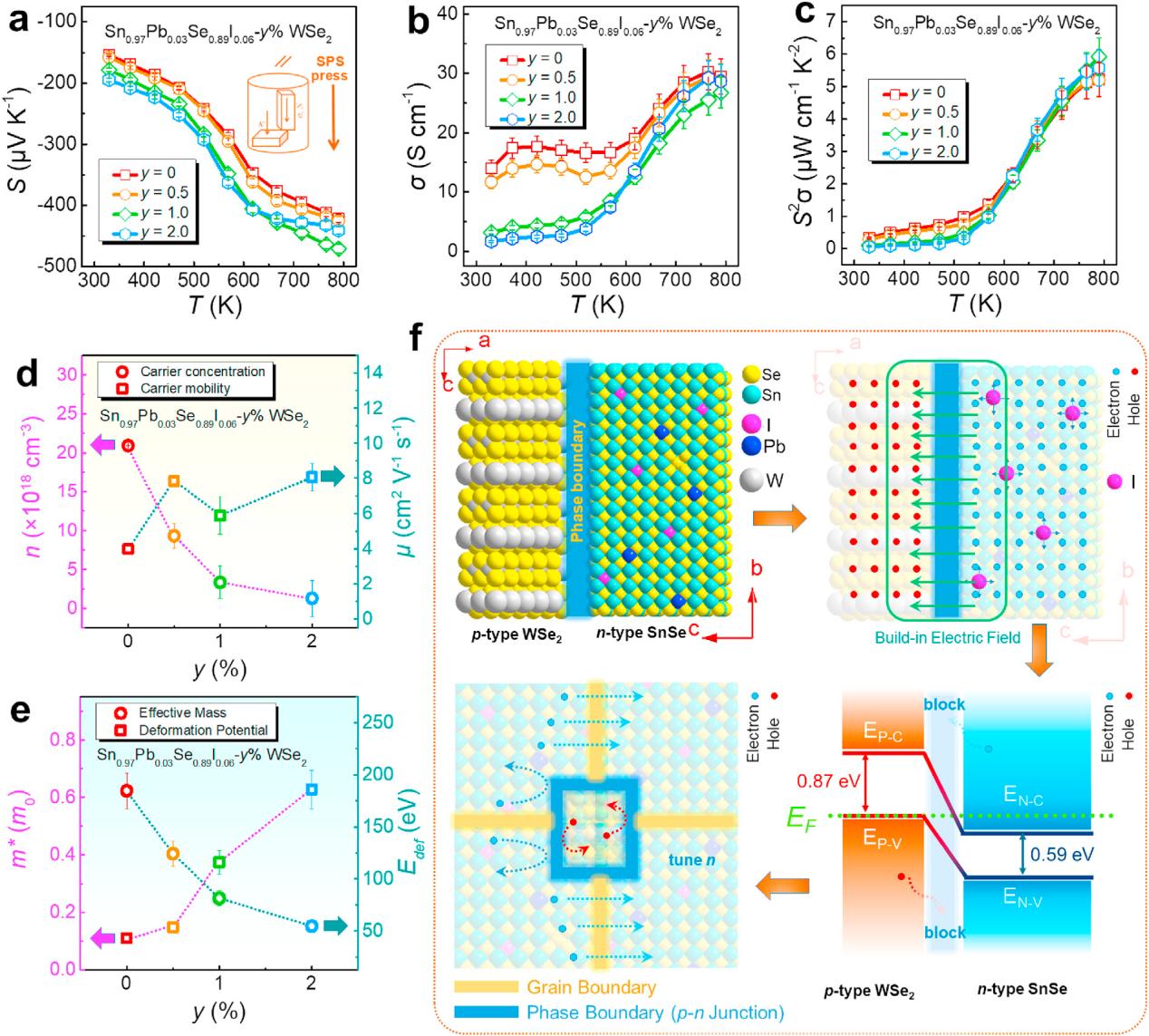 针对n型多晶SnSe热电性能不高的现状,本团队与澳大利亚陈志刚教授合作,首次通过在Pb/I双掺杂的SnSe基热电材料中引入二维WSe2 纳米颗粒形成WSe2/SnSe p-n 结。这些p-n结作为能量过滤屏障和声子散射中心大大优化了n型SnSe多晶的热电性能。成果以“Two-dimensional WSe2/SnSe p-n junctions secure ultrahigh thermoelectric performance in n-type Pb/I Co-doped polycrystalline SnSe”为题发表在国际物理学领域顶级期刊《Materials Today Physics》(JCR物理一区,影响因子:10.44)。陈跃星助理教授为论文第一作者,范平教授和郑壮豪助理教授为论文通讯作者,vsport为第一通讯单位。