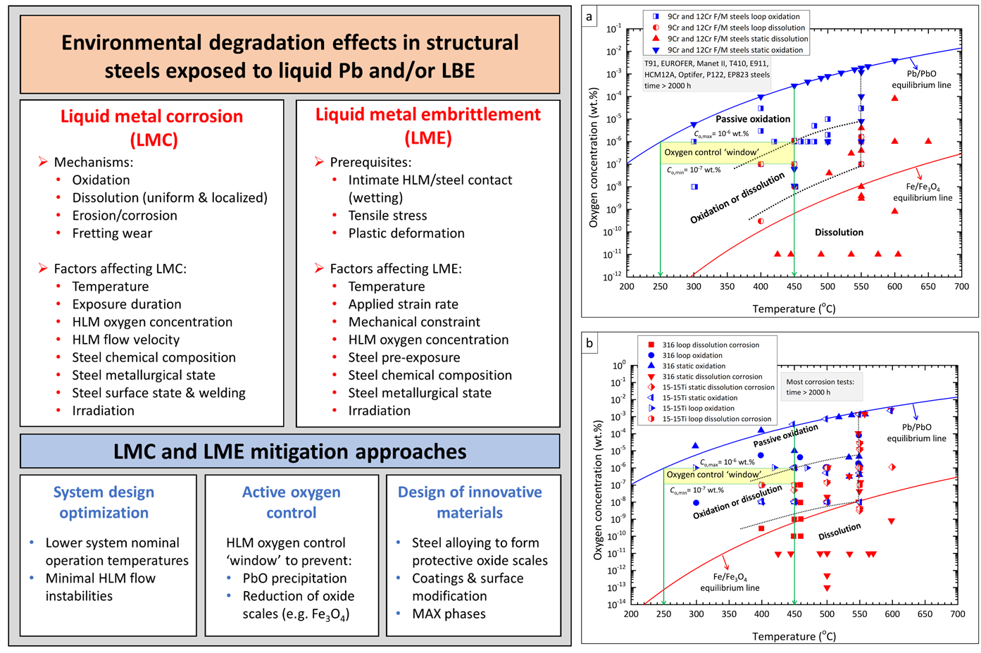 图1结构材料在铅和铅铋环境中面临的主要性能环境退化效应、抑制技术手段和氧控边界
