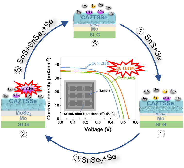 锌黄锡矿半导体Cu2ZnSn(SxSe1-x)4(CZTSSe)因其廉价无毒的元素组成以及具有大于32%的理论光电转换效率成为很有前途的薄膜光伏材料之一。近年来CZTSSe薄膜太阳电池的效率不断攀升,但仍远低于其理论值,这主要归因于较大的开路电压亏损。本文采用非真空绿色环保的溶胶凝胶法结合硒化热处理生长CZTSSe薄膜,深入剖析硒化反应机理,首次阐明了抑制锡损失的蒸气成分(气态SnSe3)以及SnSe3促进CZTSSe形成路径;并在SnS和SnSe2粉末以及Se粒结合的硒化条件下获得了高结晶度且成分可控的光吸收层CZTSSe薄膜,其后构建CZTSSe薄膜太阳电池进行物理分析,研究表明,高结晶质量的吸收层薄膜使得晶界处的能带弯曲程度最优以及有效抑制了界面复合。此外,CuZn和CuSn反位缺陷浓度显著降低,开路电压从508 mV提高到546 mV,最终获得在空气环境中制备CZTSSe薄膜太阳电池的最高光电转换效率12.89%。相关研究成果发表在Advanced Energy Materials (2023)2300521(影响因子:29.698),梁广兴和苏正华为通讯作者,其指导的硕士研究生于紫轩为第一作者,vsport为唯一通讯单位。