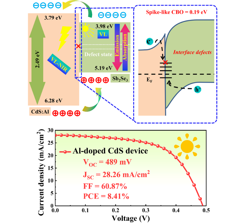 课题组提出了一种异质结界面优化策略,通过在CdS缓冲层中引入Al3+离子并进行热处理,Sb2Se3/CdS:Al异质结的能带排列可有效地由“悬崖状”结构转变为理想的“长钉状”结构,从而降低异质结界面缺陷浓度,抑制载流子非辐射复合,提高太阳电池性能;最后总结分析Sb2Se3薄膜太阳电池载流子动力学优化机制对太阳电池效率进一步提升具有重要意义。相关研究成果发表在Advanced Functional Materials (2023) 2213941(影响因子:19.924),梁广兴和陈烁为论文通讯作者,其指导的联合培养博士研究生罗燕娣为第一作者,vsport为唯一通讯单位。