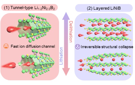图1.孔道状Li1.2Ni2.5B2和层状LiNiB的结构示意图