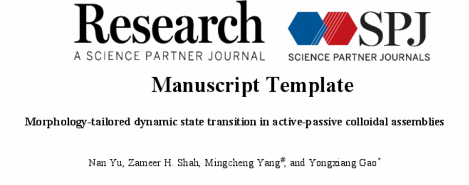 2024年1月3日,高永祥团队与中科院物理所杨明成研究员合作,在Research发表了题为 “Morphology-tailored dynamic state transition in active-passive colloidal assemblies”的研究论文。俞楠博士为论文的第一作者,高永祥研究员为论文的共同通讯作者,vsport为第一单位。