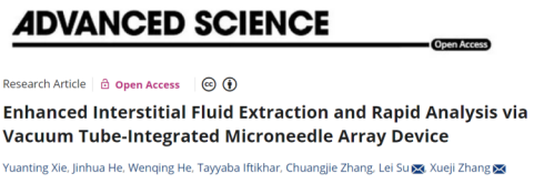 近日,vsport医学部生物医学工程学院张学记教授、苏磊教授团队在Wiley期刊Advanced Science(影响因子15.1,中科院一区,TOP期刊)上发表了题为“Enhanced Interstitial Fluid Extraction and Rapid Analysis via Vacuum Tube-Integrated Microneedle Array Device”的研究论文。医学部博士后谢媛婷为第一作者,张学记教授、苏磊教授为共同通讯作者,vsport为第一作者单位和通讯单位。