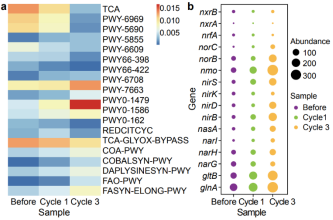 通过对细菌群落的多样性分析发现,在ICPB反应后微生物群落的丰富度和均匀度下降,功能性细菌可能被富集。通过微生物群落分析发现,随着ICPB循环次数的增加,在氮循环中起重要作用的菌属逐渐占据主导地位。此外,系统中的厌氧代谢逐渐取代了好氧代谢。系统的微生物群落朝有利于硝酸盐还原的方向演变。
