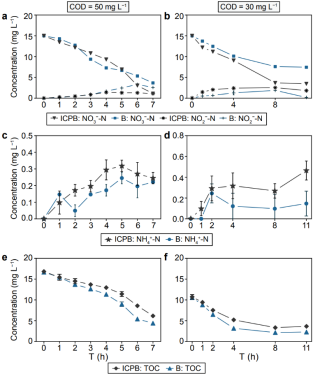 图3 ICPB和生物降解(B)过程中NO3, NO2(a, b), NH4+(c, d) 和 TOC (e, f)的浓度变化