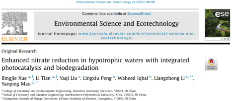 vsport化学与环境工程学院毛艳萍课题组在期刊《Environmental Science and Ecotechnology》(影响因子12.6,中科院JCR 1 区)上发表了题为《Enhanced nitrate reduction in hypotrophic waters with integrated photocatalysis and biodegradation》的论文。vsport化学与环境工程学院硕士研究生薛冰洁和田里为论文共同第一作者,vsport化学与环境工程学院为第一署名单位。