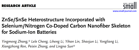 为解决金属硫族化合物作为钠离子电池负极材料时,在转化-合金化过程中伴随着的体积膨胀变形和活性材料粉化导致电极接触减弱,从集电器上剥落等问题,孙灵娜教授团队首先将ZnSn(OH)6纳米盒状前驱体与聚丙烯腈(PAN)进行静电纺丝,得到三维自支撑网络,经过碳化和硒化热处理后,开发出嵌入Se/N共掺杂CNF骨架中的ZnSe/SnSe异质结构(ZnSe/SnSe@Se,N-CNFs)。独特的ZnSe/SnSe异质结构、静电纺丝CNF和Se/N共掺杂特性可有效促进电子/离子传输速率,提高结构稳定性,加速电化学反应动力学:I) ZnSe/SnSe中的异质边界将提供增强的界面耦合效应和内置电场,具有额外的电荷转移驱动力,可吸引更多Na+离子吸附在异质界面上,提高Na+离子从电解液到电极的迁移速率,从而有效加速电化学反应动力学。Ⅱ) 嵌入ZnSe/SnSe纳米盒的三维自支撑CNF网络不仅能增强半导体ZnSe/SnSe的导电性,还能避免在嵌入/脱出过程中发生剧烈的体积膨胀/收缩,改善其结构的完整性。Ⅲ) Se/N共掺杂特性实现了CNF基体与硒化异质结构之间的耦合效应,实现了离子/电子的快速传输,加速了钠离子储存的表面/内部反应动力学,并增强了CNF基体的电子导电性和电解液润湿性。这项研究为解决目前合金基材料在钠离子电池中所面临的挑战提供了一些具有启发性的设计思路:通过异质纳米结构构建、碳壳涂层和共掺杂改性策略,提高了导电性;通过将合金材料嵌入具有三维独立骨架特征的碳基体,解决了体积膨胀问题。该论文《ZnSe/SnSe Heterostructure Incorporated with Selenium/Nitrogen Co-Doped Carbon Nanofiber Skeleton for Sodium-Ion Batteries》发表在《Small》(影响因子13.3,中科院JCR 2 区),vsport化学与环境工程学院张颖朦研究员、硕士研究生程乐乐为共同第一作者,张颖朦研究员、孙灵娜教授为共同通讯作者,vsport化学与环境工程学院为通讯单位。