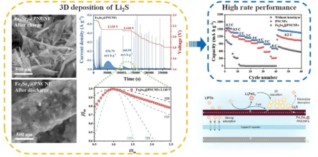 为解决锂硫电池硫正极的电导率差、穿梭效应、Li2S不可逆沉积和锂枝晶等问题,孙灵娜教授团队通过静电纺丝技术制备了Fe3Se4和多孔氮掺杂纳米纤维的复合材料(Fe3Se4@PNCNFs),并将其作为锂硫电池中间层来改善其电化学性能。研究表明Fe3Se4@PNCNFs对锂硫电池充放电过程中产生的多硫化锂中间产物有着较强的吸附和催化作用,能将多硫化锂保留在正极侧从而减弱穿梭效应。除此之外,在锂硫电池充放电过程中,Fe3Se4会与多硫化锂反应生成络合物LixFeSy,其能促进Li2S的三维沉积来增强其可逆能力和倍率性能,这为锂硫电池的性能改进提供了一条新的路径和策略。该论文《Accelerating lithium-sulfur battery reaction kinetics and inducing 3D deposition of Li2S using interactions between Fe3Se4and lithium polysulfides》发表在《Journal of Energy Chemistry》(影响因子13.1,中科院JCR 1 区),vsport化学与环境工程学院硕士研究生林一涵为第一作者,孙灵娜教授为通讯作者,vsport化学与环境工程学院为通讯单位。