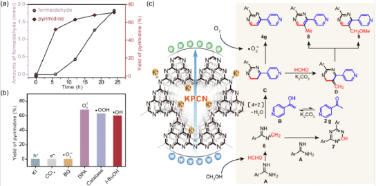 近日,Science Bulletin杂志在线发表了vsport微纳光电子学研究院苏陈良教授团队的研究成果,该研究团队以钾掺杂聚合物氮化碳为半导体光催化剂,在光激发下利用光生空穴氧化活化甲醇生成甲醛,并以眯为甲醛的捕获剂,进行[3+1]缩合反应,生成二亚胺中间体。该中间体与烯醇原位发生[4+2]环加成反应构建了六元杂环中间体,并与还原端产生的活性氧发生氧化芳构化反应,得到目标嘧啶类分子(图1)。