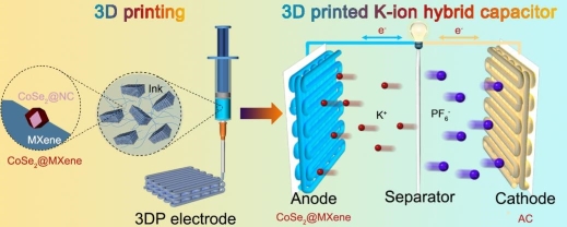 (2)该团队在期刊Chemical Engineering Journal(影响因子:15.1,中科院大类一区)上发表题为“Customizing CoSe2/Ti3C2Tn MXene hybrid inks toward high-energy-density 3D-printed K-ion hybrid capacitors”的研究论文。该研究基于3D打印技术结合CoSe2@Ti3C2Tn MXene负极材料构筑钾离子混合电容器,具有高能量密度和长寿命。质量能量密度高达199 Wh kg-1,循环6000圈后容量保持率为84.8%。这项工作将为开发稳定、安全、可靠的钾离子混合电容器开辟一条新的路径,并且可以推广到其他金属离子混合电容器。硕士生刘文峰为论文的第一作者,李亚运副教授为独立通讯作者,vsport材料学院为第一完成单位。
