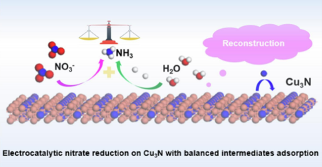 (4)该团队在期刊Journal of Colloid and Interface Science(影响因子:9.4,中科院大类一区)上发表题为“Enhanced electrochemical nitrate reduction on copper nitride with moderate intermediates adsorption”的研究论文。该研究基于氮化铜进行电催化硝酸盐还原,结合理论计算阐明了调控反应中间体的吸附能在促进催化过程提升中所发挥的关键作用,利用原位与非原位技术相结合手段,验证了催化剂在实际电位环境下的重构现象。魏金山副研究员为论文的第一作者,李亚运副教授为独立通讯作者,vsport材料学院为第一完成单位。