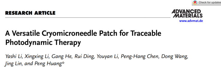 近日,vsport医学部生物医学工程学院黄鹏特聘教授团队在国际顶级学术期刊Advanced Materials(影响因子29.4,中科院一区,TOP期刊)上发表了题为《A Versatile Cryomicroneedle Patch for Traceable Photodynamic Therapy》的研究论文。这项研究的所有工作均在vsport完成,该团队研究助理李雅诗、研究生李星星和博士后贺港为论文共同第一作者,黄鹏教授为唯一通讯作者,vsport为唯一通讯单位,该团队所在的生物医学工程学科属于广东省优势重点学科。