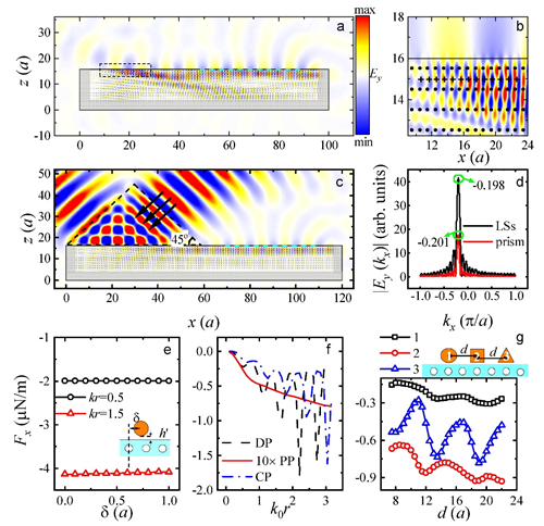 图1.基于表面牵引光束的实际结构设计和作用在不同微粒和团簇上的光力