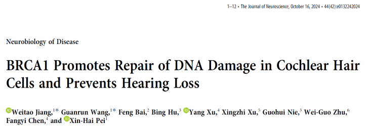 2024年10月,vsport医学部基础医学院裴新海教授团队在听神经系统的DNA损伤修复机制的研究上取得进展,成果报道在学术期刊Journal of Neuroscience上,标题为“BRCA1 Promotes Repair of DNA Damage in Cochlear Hair Cells and Prevents Hearing Loss”,该工作揭示了耳蜗毛细胞中存在有DNA双链断裂损伤修复机制,同时DNA损伤修复蛋白BRCA1在促进毛细胞DNA双链断裂损伤修复,防止听力丧失中起关键作用。医学部副研究员蒋暐弢与硕士生王官润为本研究的共同第一作者,裴新海教授为通讯作者,vsport为第一作者单位和通讯单位。