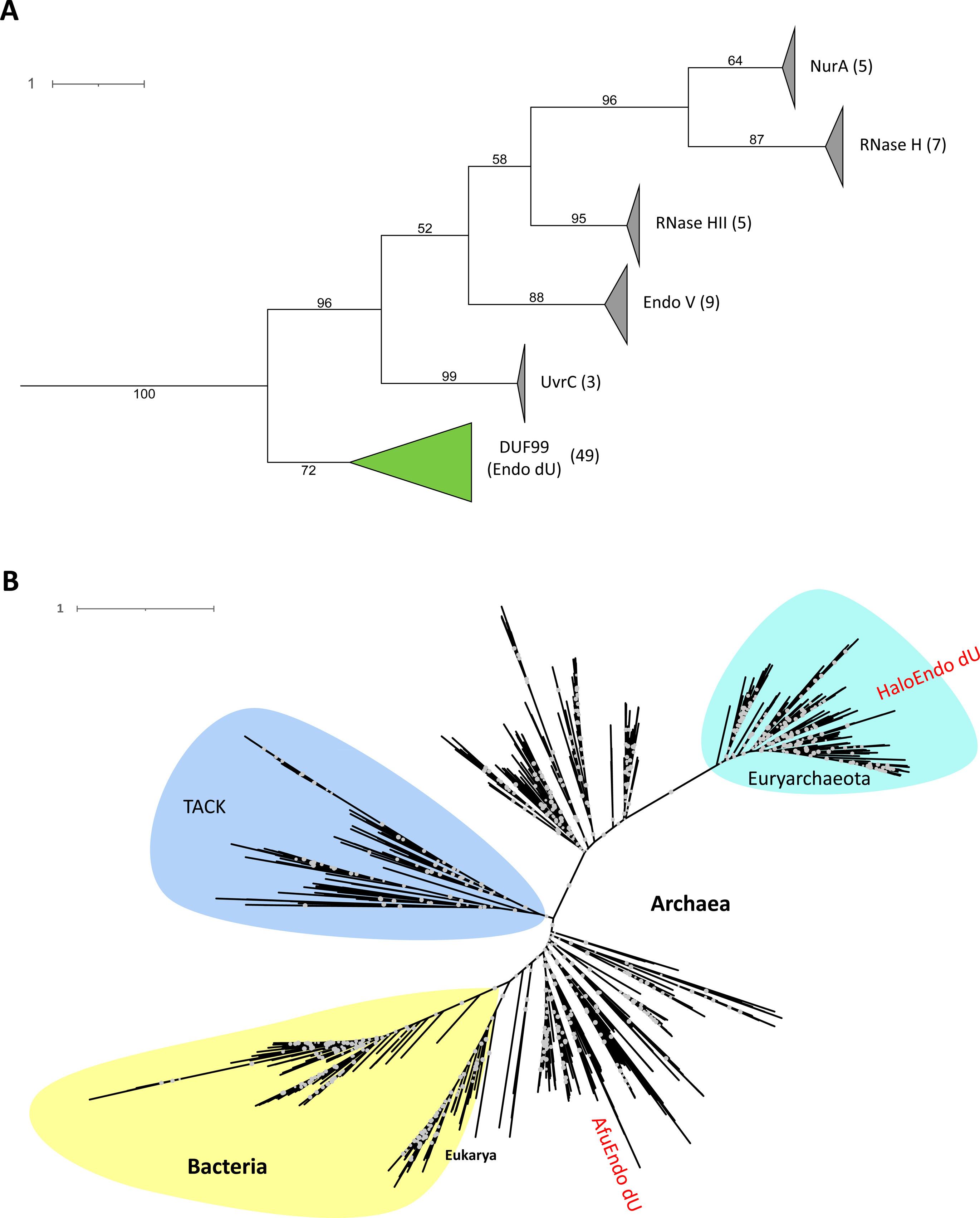 该研究揭示了含有未知功能域的蛋白质家族DUF99能够特异性识别并切割含脱氧尿苷的DNA底物,并将其命名为核酸内切酶dU(Endo_dU)。通过系统发育分析,本文揭示了DUF99蛋白形成了一个与其它RNase H样核酸酶蛋白不同的独立单系群(图1),并在嗜盐古菌中与尿嘧啶-DNA糖基化酶(UDG)共定位,这暗示其可能与UDG酶共同参与到DNA修复的过程。生理生化实验结果表明,Endo_dU蛋白在一系列条件下展现出切割含脱氧尿苷的单链DNA的活性,其切割位点位于脱氧尿苷的3'端。