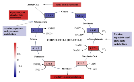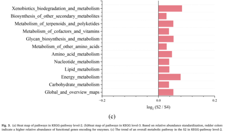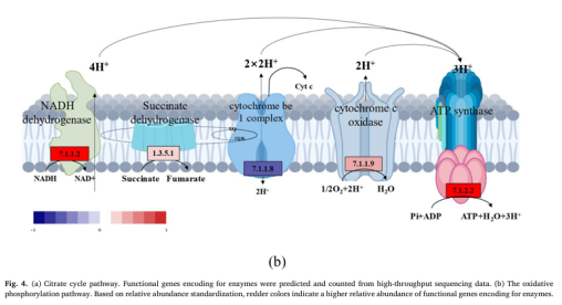 为了理解低电压电场导致E-AnMBR中生物膜变厚这一过程所涉及的机制,我们利用宏基因组技术检测了非电活性细菌群落的功能基因丰度,从而绘制了群落中的元代谢网络图。通过宏基因组分析,从基因水平鉴定了非电活性细菌在电场作用下的代谢途径谱图。功能分析基于KEGG数据库对高丰度代谢途径酶的编码基因进行了标记(图3)。与S4相比,与非电活性细菌生长相关的各种有机物的生物合成和代谢基因(即碳水化合物代谢、脂质代谢和氨基酸代谢)在S2中总体呈上升趋势(图3c),而S1和S3总体呈下降趋势(图3a)。这一结果表明,电场刺激了非电活性细菌的代谢能力。与S4相比,S2的群体感应(QS)基因比SI和S3的要丰富得多(图3b)。QS基因的增加可能有助于细菌之间的信息交换和非电活性细菌的生物膜形成(Sun et al. 2018)。电场还可以干扰微生物群落中的信号通路和通讯机制,包括群体感应,这对生物膜的形成非常重要(Zhou et al. 202b)。氨基酸旺盛的代谢活性(即Glyoxylate和dicarboxylate, Pyruvate,Glycine serine和苏氨酸)进一步证实了这一点(图3a)。基于功能基因预测分析,电场调节碳代谢影响NADH再生和氧化磷酸化编码脂肪酸代谢途径酶的功能基因的增加表明有可能有更多的乙酰辅酶a被燃料注入柠檬酸循环(图4a)。柠檬酸循环途径中编码琥珀酸脱氢酶1.3.5.1、琥珀酸- coa合成酶(6.2.1.5)和2-0xoglutarate reductase[1.2.7.3]的功能基因的高丰度也证实了这一点(图4a)。同时,琥珀酸脱氢酶[1.3.5.1]和2-氧戊二酸还原酶[1.2.7.3]编码的功能基因丰度高,表明会产生更多的氧化磷酸化底物FADH2和NADH。因此,加快了氧化磷酸化的电子传递速度。这表明FADH2和NADH积累,促进了氧化磷酸化过程中的电子转移。事实上,编码氧化磷酸化途径酶的功能基因明显增加(图4b),类似于大多数其他编码参与柠檬酸循环的酶的基因(图4a)。总体而言,电场(0.5 V)通过调节碳代谢影响NADH再生和氧化磷酸化,显著影响非电活性细菌的生物膜形成。3.5. 电场与非电活性细菌代谢途径的相互作用关系代谢途径功能基因、固碳基因、碳代谢基因、TCA循环基因、群体感应基因具有较高的相关系数(图5)。它们的最低相关系数为0.80。说明编码酶的代谢途径基因增加,编码酶的QS基因也会增加。因此,在anmbr中,非电活性细菌是通过电场控制生物膜的关键贡献者。