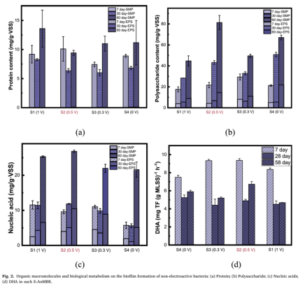 通过SEM观察非电活性菌的生物膜形成情况,生物膜厚度在350 ~ 800 μm之间(图S7)。与S4中的生物膜(468 μm)相比,发现过低(0.3 V)和过高(1 V)的电场电压都阻碍了非电活性细菌在膜表面的生物膜生长。0.5 V电场(S2)显著提高了非电活性细菌的生物膜厚度(780 um),达到S4的1.6倍。此外,S2 (0.5 V)较高的zeta电位绝对值(31.6 mV, p < 0.01)也进一步支持了这一点(图S8)。由此可见,电场显著调节非电活性细菌生物膜的发育,而0.5 V电场则明显刺激非电活性细菌在膜表面的形成。进一步的研究发现,较低的PN/PS被认为增加了非电活性细菌在膜上不可逆的生物膜形成。从图2(a)和(b)可以直观地看出,PN/PS值为S1 (1 V)> S3 (0.3 V)> 54 (0 V)> S2 (0.5 V),S3 (0.3 V)和S1 (1 V)使PN/PS值高于S4,而S2 (0.5 V)使其降低。这一结果与S2的生物膜最厚的观察结果相一致。在0.5 V电场作用下,核酸最高(26.8 mg/g VsS, p < 0.01)。同时,S2的生物膜越厚,其核酸含量也可能越高。这一结果解释了为什么0.5 V电场会加剧由于非电活性细菌生物膜在膜表面形成的不可逆性污染。此外,S2的高脱氢酶活性(DHA)含量(9.36 mg/g VSS, p < 0.01)也支持了这一结论(图d)。在生物处理过程中,高DHA产生更多的代谢废物,从而导致非电活性细菌形成更严重的生物膜。与S4相比,S2的DHA含量增加,而S3和S1的DHA含量则受到抑制。因此,0.5 V电场可以促进非电活性细菌的生物膜形成,并积聚在膜表面。