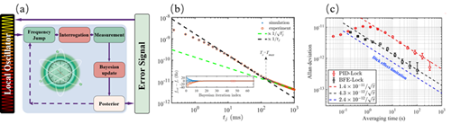 李朝红团队基于自主搭建的冷铷原子相干布居数囚禁钟,利用贝叶斯量子参数估计首次在积分时间尺度上实现了海森堡标度【T^(-1)】的钟跃迁频率测量,并用于此原子钟的闭环锁定。团队研究人员通过设计适用于原子钟锁定的贝叶斯量子参数估计算法【图(a)】,利用具有指数增长积分时间的拉姆塞干涉测量序列,同时在贝叶斯迭代过程中自适应调节本地振荡器的频率,实现钟跃迁频率的测量。经过迭代,贝叶斯估计值趋于钟跃迁频率,在积分时间到达最大相干时间前,频率测量的灵敏度遵循海森堡标度【图(b)】。进一步,利用基于贝叶斯量子参数估计的钟跃迁频率测量,将本地振荡器频率直接锁定在原子跃迁频率上,实现了原子钟的贝叶斯闭环锁定。相对于传统的PID锁定,利用贝叶斯量子参数估计锁定的原子钟的稳定度提高了5.1(4)dB【图(c)】。相比美国国家标准与技术研究院报道的稳定度1.3*10^(-11)/τ^(1/2)【Appl. Phys. Lett. 111, 224102 (2017)】、英国斯特拉斯克莱德大学报道的稳定度2*10^(-11)/τ^(1/2)【Optics Express 27, 38361 (2019)】和中国计量科学研究院报道的稳定度2.4*10^(-11)/τ^(1/2)【Chin. Phys. B 31, 043201 (2022)】,李朝红团队利用贝叶斯量子参数估计得到的稳定度为4.3*10^(-12)/τ^(1/2),是目前冷原子相干布居数囚禁钟的最高稳定度。此外,基于贝叶斯量子参数估计的原子钟锁定对技术噪声具有极好的鲁棒性。
