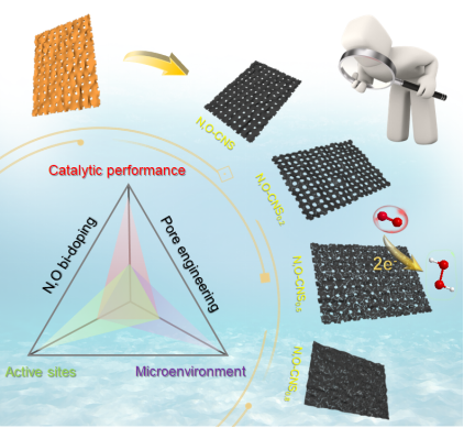 (3)通过有限元模拟的预测,采用杂原子前驱体预聚合和孔工程的策略,构建了微/介孔N,O共掺杂碳纳米片。碳纳米片上独特的微/介孔结构可以促进氧气的富集和质子的消耗,从而形成局部伪碱性的微环境。此外,N和O的双掺杂优化了*OOH中间体的吸附能,提高了碳材料的固有活性,在中性介质下实现了极高的H2O2产率。该成果以“Unveiling Favorable Microenvironment on Porous Doped Carbon Nanosheets for Superior H2O2Electrosynthesis in Neutral Media”为题,发表在Advanced Energy Materials(IF=29.4),博士后景铃胭为第一作者。