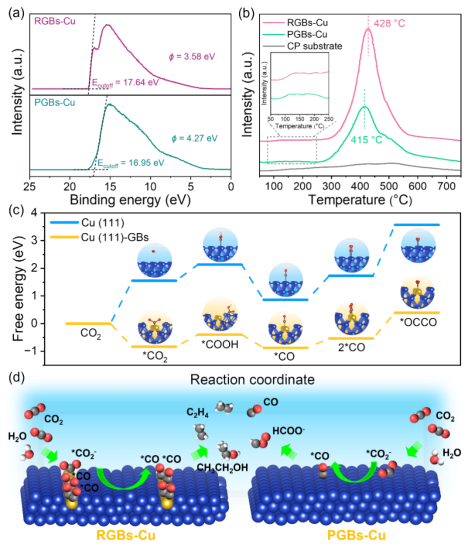 (4)利用金属有机框架(MOF)的空间限域效应,成功原位合成了具有丰富晶界的铜纳米颗粒催化剂。在该催化剂中,晶界的丰富存在改变了周围原子的电子结构,从而影响了中间体的吸附强度,并创造了一个富含*CO的局部微环境,这对于多碳产物的生成极为有利。同时,这种原位生成的晶界显示出良好的稳定性,避免了在电解条件下的二次重构,从而能够更有效地揭示构效关系。该成果以“Constructing Favorable Microenvironment on Copper Grain Boundaries for CO2Electro-conversion to Multicarbon Products”为题,发表在Nano Letters(IF=9.6)上,博士生孔艳为第一作者。