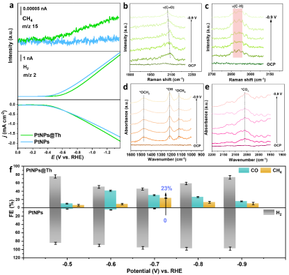 (1)利用有机掺杂策略,将大量分子修饰在Pt纳米微晶中,从而改变了金属Pt的催化性质。通常在水溶液体系中占主导的电催化氢析出性能,被成功的转换为CO2电还原性能。所制备的PtNPs@Th催化剂,可在酸性条件下将CO2电还原为CH4,同时表现出超过100小时的稳定性。该成果以“Molecular modification enables CO2electroreduction to methane on platinum surface in acidic media”为题,发表在National Science Review(IF=16.3),博士后蔡慧珠为共同第一作者。