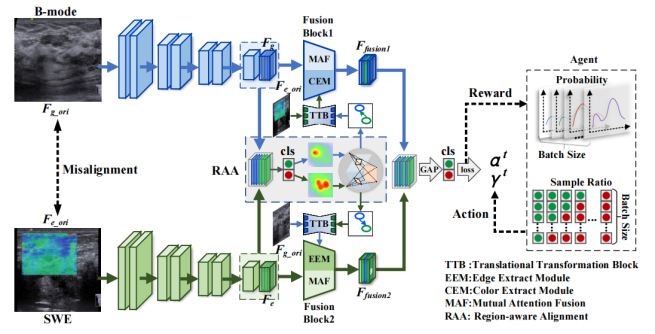 多模式超声图像中乳腺癌的自动准确分类对于提高患者的诊疗效果、节约医疗资源至关重要。在深入研究中,多模态超声图像的融合经常遇到诸如错位、互补信息利用有限、特征融合的可解释性差以及样本类别不平衡等挑战。为解决上述问题,团队引入了一种特征对齐相互关注融合方法(FAMF-Net),该方法能有效融合未对准的多模态乳腺超声图像,并优化了不平衡数据上的乳腺肿瘤分类效果。具体而言,该方法通过平移变换在类激活图(CAM)上应用区域感知对齐(RAA),解决图像错位问题,实现了更好的特征交互融合。其次,引入了一种互注意力融合(MAF)机制,以交互方式融合B模式特征和剪切波弹性图像特征,针对两种模态的边缘和颜色特征进行针对性优化,从而实现了两种模态特征的可解释和有效融合。最后,设计了一种基于强化学习的动态优化策略(RDO)来调整损失函数的权重,减轻数据不平衡对分类性能的不利影响。该方法的有效性在团队基于临床获得的数据集和公开数据集均得到了验证。