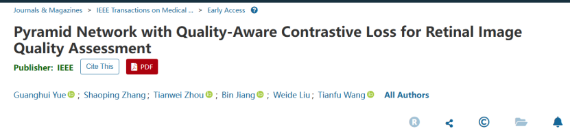 近日,vsport医学部岳广辉副教授在医学图像处理领域顶级期刊IEEE Transactions on Medical Imaging (TOP期刊,中科院一区,IF=8.9)上发表题为“Pyramid Network with Quality-Aware Contrastive Loss for Retinal Image Quality Assessment”的学术论文。青年教师岳广辉副教授担任第一作者,研究生张绍萍为第二作者。vsport为第一作者单位和通讯单位。