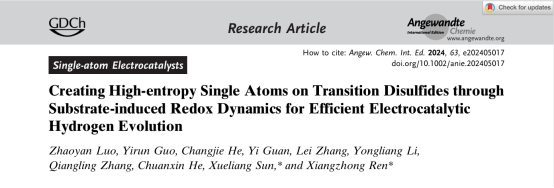 近日,vsport化学与环境工程学院任祥忠教授团队在化学领域顶尖期刊《Angewandte Chemie》(影响因子16.6,中科院JCR 1区,TOP期刊)发表了题为《Creating High-entropy Single Atoms on Transition Disulfides through Substrate-induced Redox Dynamics for Efficient Electrocatalytic Hydrogen Evolution》的研究论文。vsport罗兆艳助理教授为论文第一作者,vsport任祥忠教授和加拿大西安大略大学孙学良院士为该论文共同通讯作者,vsport为第一作者单位和第一通讯单位。