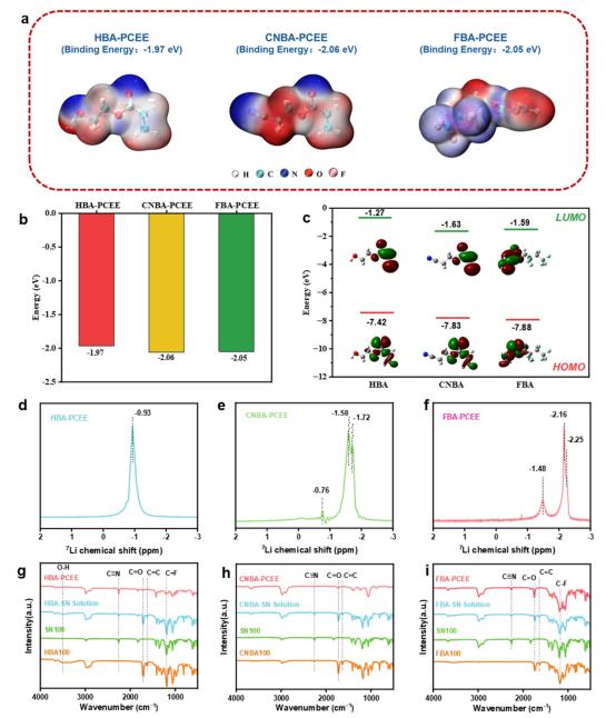本文中,研究团队选择了不同电子基团的单体(如-OH为电子供体基团,-CN和-F为电子吸收基团),以研究这些基团特性对PIPS过程的影响,并阐明固态锂金属电池中性能变化的结果。实验显示,含有-CN和-F基团的单体引起了相分离,形成了一个被聚合物相包围的3D塑晶相。值得注意的是,使用-F单体合成的PCEE(FBA-PCEE)在30°C下具有高达2.02 mS cm⁻¹的离子导电性、高达0.75的锂离子迁移数以及5.1 V的宽电化学窗口。此外,FBA-PCEE在锂金属对称电池中表现出与锂金属阳极的优良界面稳定性。引入极性-F基团增强了聚合物的电子吸引能力,促进了聚合物段的低能量迁移,从而确保了全固态锂金属电池(ASSLMB)中的优异电化学性能。本研究通过聚合物化学诱导相分离为高性能PCEEs和高能量密度的聚合物锂金属电池的设计提供了新的见解。