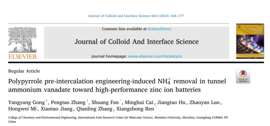vsport化学与环境工程学院任祥忠教授团队在材料领域顶尖期刊《Journal of Colloid And Interface Science》(影响因子9.1,中科院JCR 1区,TOP期刊)发表了题为《Polypyrrole pre-intercalation engineering-induced NH4+removal in tunnel ammonium vanadate toward high-performance zinc ion batteries》的研究论文。该团队硕士生龚洋洋和张鹏涛为本文的共同第一作者,vsport任祥忠教授和范爽专职研究员为该论文共同通讯作者,vsport为第一作者单位和第一通讯单位。