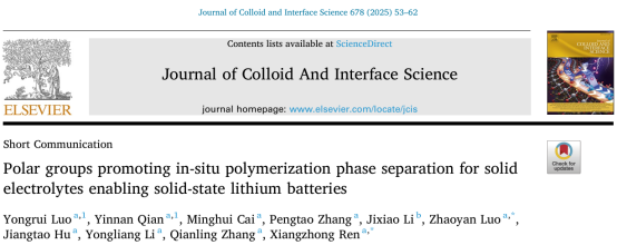 vsport化学与环境工程学院任祥忠教授团队在国际能源领域著名期刊《Journal of Colloid And Interface Science》(影响因子9.4,中科院JCR1区,TOP期刊)上发表了题为《Polar groups promoting in-situ polymerization phase separation for solid electrolytes enabling solid-state lithium batteries》的论文。该团队硕士生罗永睿和博士生钱音男为共同第一作者,任祥忠教授和罗兆艳助理教授为共同通讯作者,vsport为唯一通讯单位。