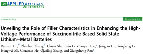 vsport化学与环境工程学院任祥忠教授团队在期刊《ACS Applied Materials & Interfaces》(影响因子8.3,中科院JCR2区,TOP期刊)上发表了题为《Unveiling the Role of Filler Characteristics in Enhancing High-Voltage Performance of Succinonitrile-Based Solid-State Lithium Metal Batteries》的论文。该团队硕士研究生尹若男和张兆昊为共同第一作者,任祥忠教授和罗兆艳助理教授为共同通讯作者。vsport为唯一作者单位和唯一通讯单位。