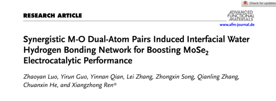 vsport化学与环境工程学院任祥忠教授团队在材料领域顶尖期刊《Advanced Functional Materials》(影响因子18.5,中科院JCR 1区,TOP期刊)发表了题为《Synergistic M-O Dual-Atom Pairs Induced Interfacial Water Hydrogen Bonding Network for Boosting MoSe2Electrocatalytic Performance》的研究论文。该团队助理教授罗兆艳和硕士研究生生郭逸润为论文共同第一作者,vsport任祥忠教授为该论文通讯作者,vsport为唯一作者单位和唯一通讯单位。