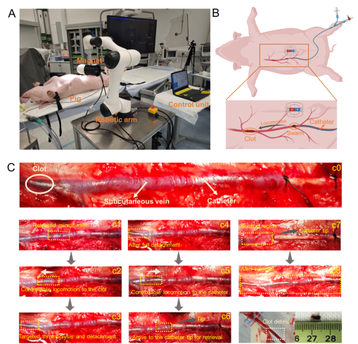 血栓性疾病,如缺血性卒中、肺栓塞和心肌梗死,严重威胁人类健康。现有治疗方法如机械取栓和溶栓等,存在操作复杂、治疗时间长及潜在副作用等问题。为了克服这些挑战,研究团队合成了高酶活性的tPA-modified 纳米颗粒。在设计的磁场作用下,tPA-microswarm 能沿血管壁精准降解血栓并快速剥离碎片(图1)。碎片被磁化后,通过螺旋游动推进,最终由导管吸力回收。整个过程,包括导管输送、可控运动、血栓剥离和回收,可在约半小时内完成,显著快于传统溶栓治疗时间。研究表明,该策略在模拟血管和活体猪模型中均展现高效性与安全性(图2),为急性血栓性疾病的快速治疗提供新可能。