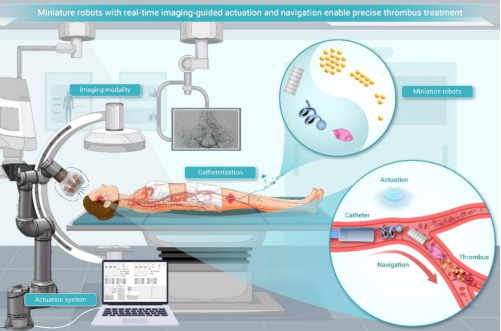 图3.微型机器人驱动与成像系统引导下的大脑深部血栓治疗示意图。