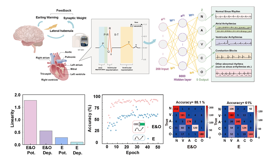 神经形态计算系统通过整合存储和计算功能,提供了解决传统冯·诺依曼架构局限性的方法。光电突触晶体管能够响应光信号和电信号,实现多功能操作并具有低功耗。然而,短数据保持时间和低处理效率等挑战仍然存在。本研究提出了一种光电突触晶体管,利用二硫化钼、二维Zn2(bim)4和金纳米颗粒分别作为半导体、隧穿层和浮栅材料。通过调整隧穿层的厚度,可以调节的电荷阻挡能力,从而改善长期数据保持能力。二硫化钼的光电特性和金纳米颗粒的电荷捕获能力使得该晶体管能够模拟突触行为,如突触后电流、长期增强以及从短期记忆到长期记忆的转换。该器件还可以集成到人工神经网络中,用于智能医疗应用,通过光电双模刺激在心电图分类中实现了88.1%的准确率。此项研究得到国家自然科学基金、英国皇家化学会、射频异质异构集成全国重点实验室自主课题、广东省基础与应用基础研究基金、深圳市科创局、vsport与台北科技大学2024年合作研究的资助。