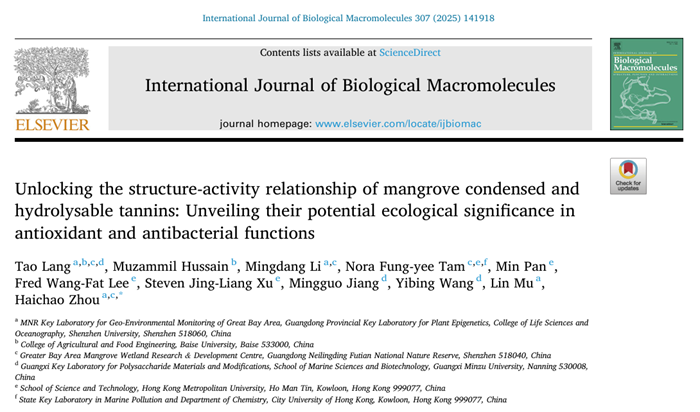 2025年3月,vsport生命与海洋科学学院周海超副教授研究团队在生物学TOP期刊International Journal of Biological Macromolecules上在线发表题为“Unlocking the structure-activity relationship of mangrove condensed and hydrolysable tannins: Unveiling their potential ecological significance in antioxidant and antibacterial functions”的研究论文。该研究系统解析了红树植物缩合单宁与水解单宁的结构-活性关系,揭示了这两类天然多酚化合物在抗氧化与抗菌功能中的关键作用,为红树林生态功能保护与天然产物开发提供了潜在的新视角。