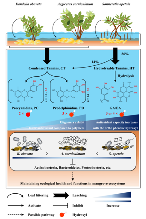 红树林生态系统作为热带和亚热带潮间带的独特湿地生态系统,具有极高的生态价值。植物单宁一直被认为是红树林之所以为“红”的主要原因。单宁作为重要的植物次生代谢产物,在红树植物皮和叶片等组织中高达20-40%干重含量,具有独特的活性及复杂结构特征,对红树植物适应环境和调节红树林生态系统的生态过程起着关键作用。